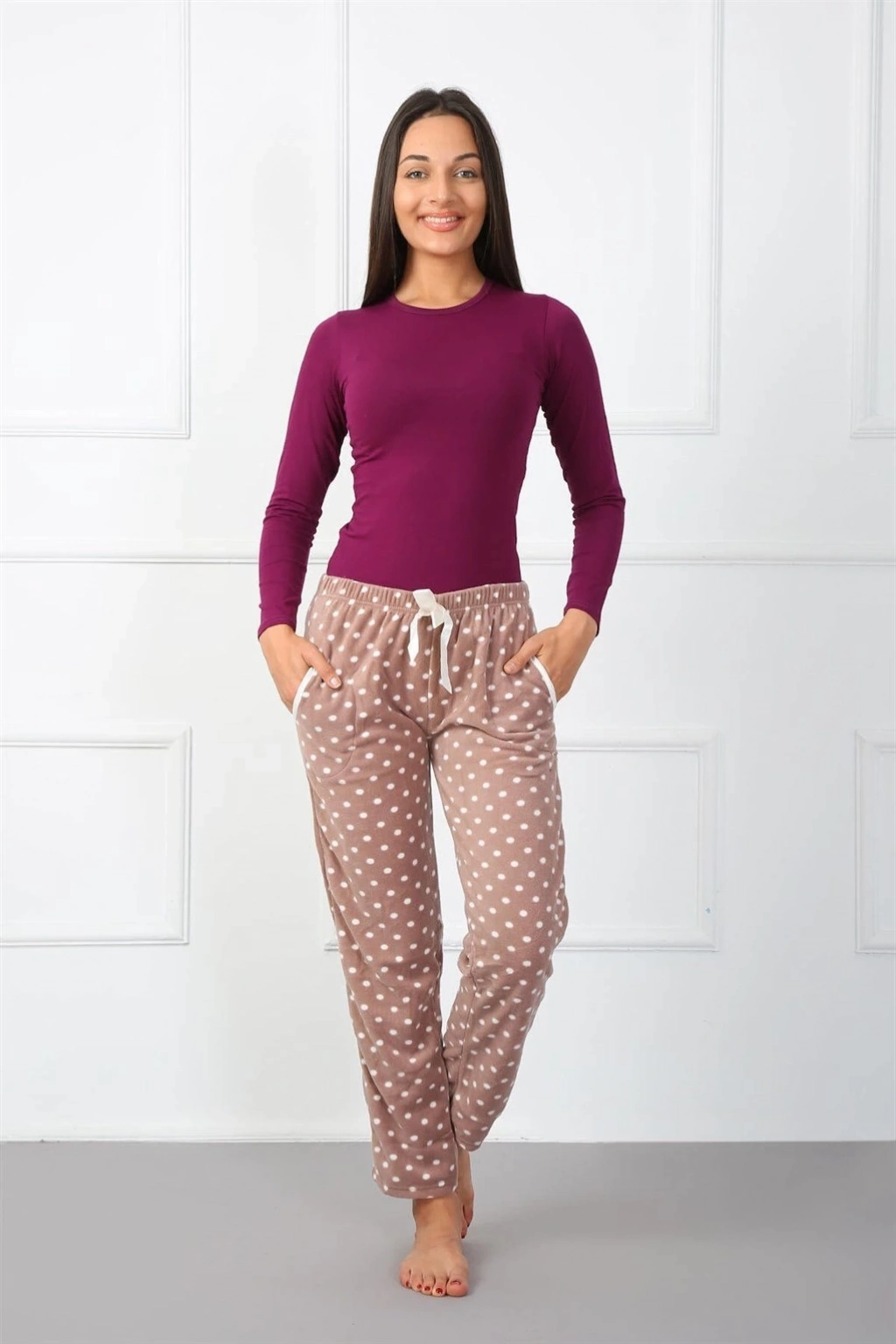 Çamaşır Kenti marka bayan polar tek alt pijama kahve rengi ile şıklığı ve rahatlığı bir arada sunuyor.