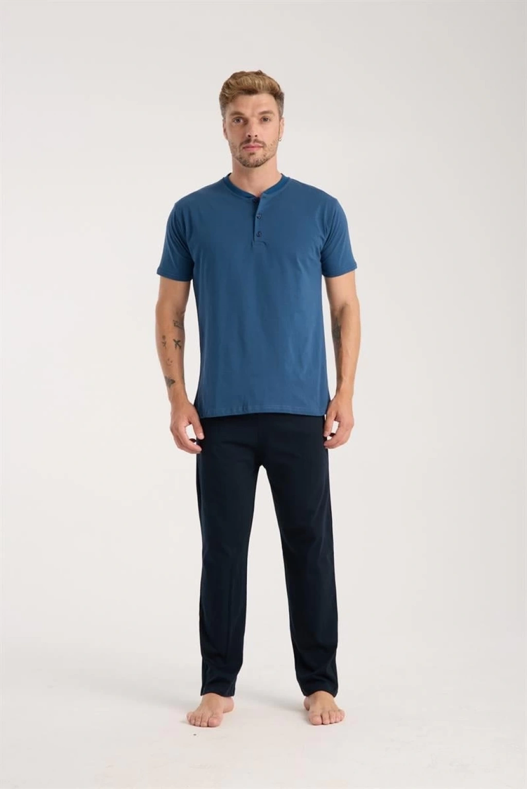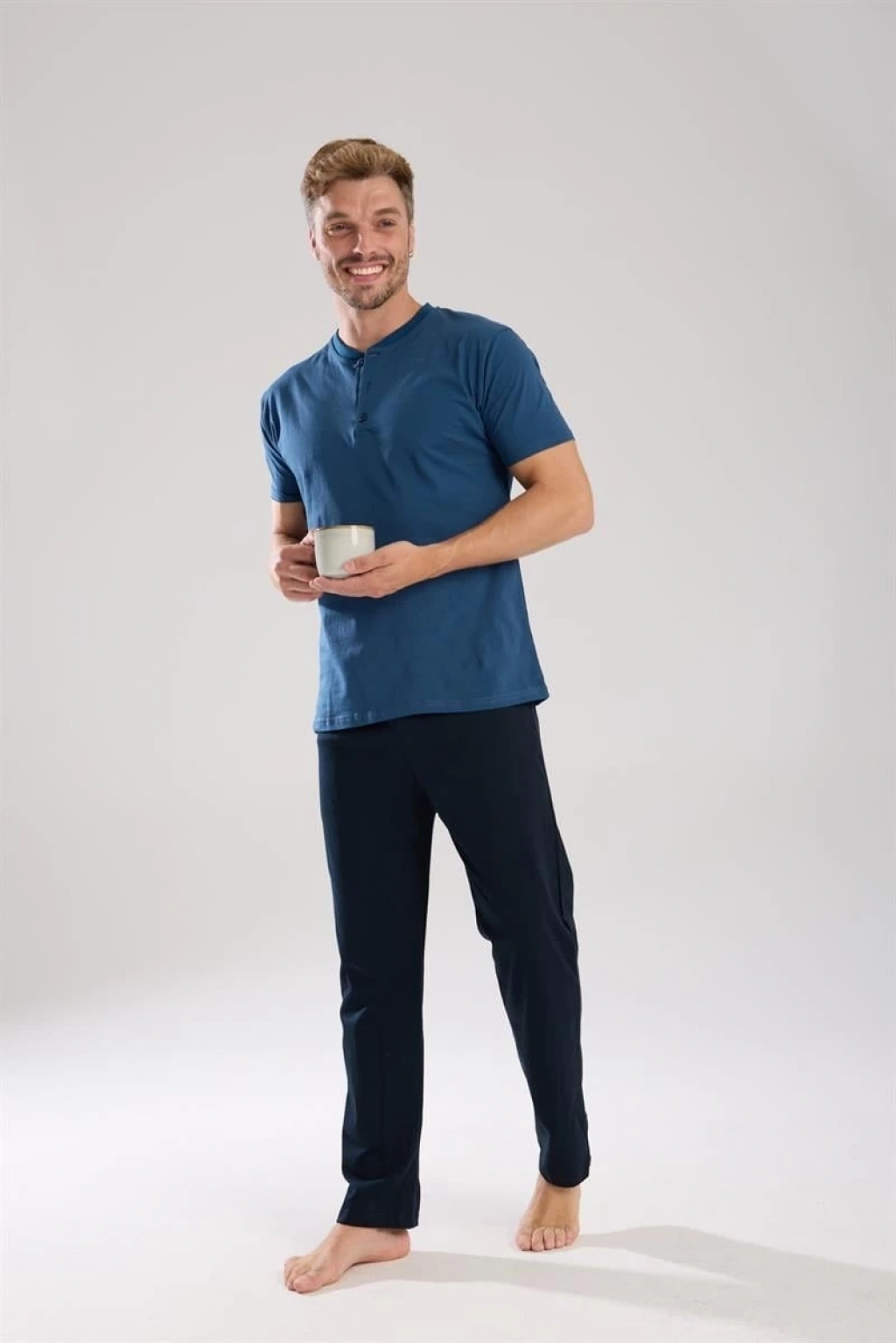 Erkek İndigo Düğmeli Yaka Kısa Kol Pijama Takımı ile hem şık hem de rahat bir gece geçirebilir, günün yorgunluğunu üzerinizden atabilirsiniz.