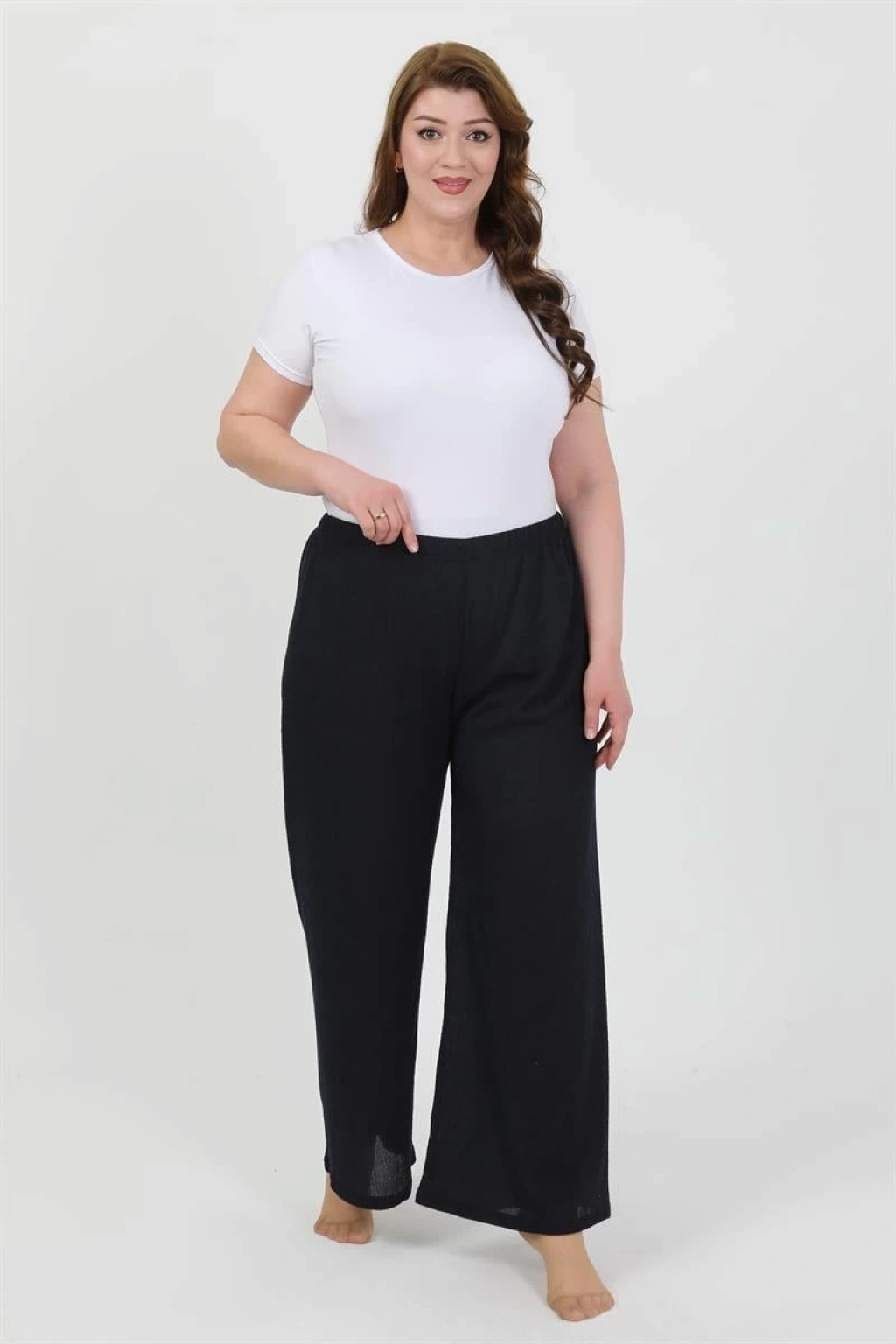 Kadın Büyük Beden Bürümcük Pantolon Lacivert, şıklığı ve rahatlığı bir arada sunuyor. Çamaşır Kenti markasının özenle tasarladığı bu pantolon, büyük beden bayanlar için mükemmel bir seçenektir.