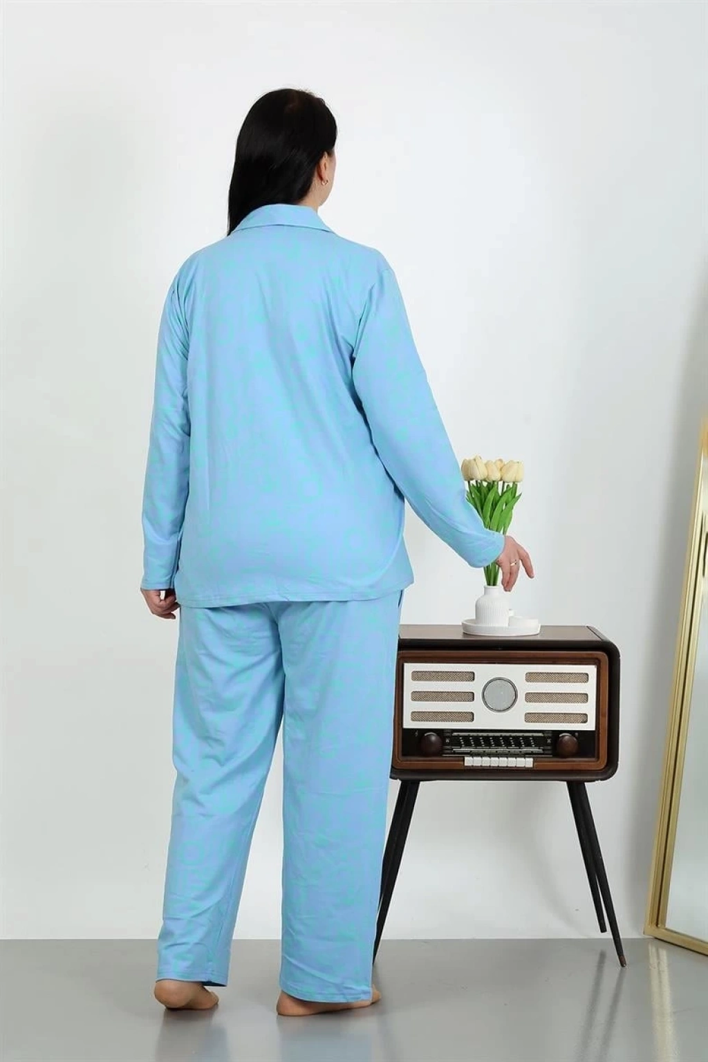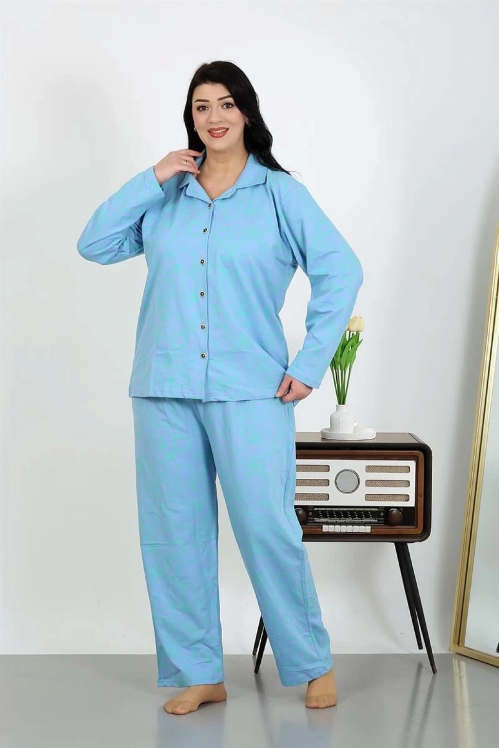 Kadın Büyük Beden Pamuklu Cepli Düğmeli Mavi Pijama Takımı ile hem şıklığı yakalayacak hem de günün yorgunluğunu rahatlıkla üzerinizden atacaksınız.