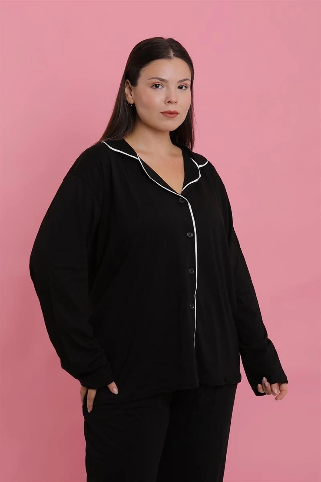 Çamaşır Kenti markasının şık ve konforlu bir seçimi olan Kadın Büyük Beden Siyah Düğmeli Pijama Takımı, büyük beden kullanıcılar için özel olarak tasarlanmıştır.