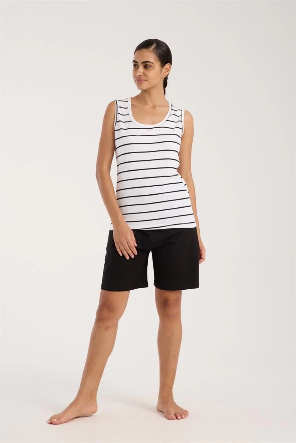 Kalın askılı üstü ve şortuyla tam bir uyum içinde.
