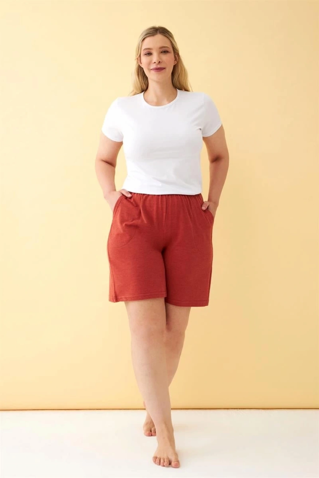 Çamaşır Kenti Kadın Kiremit Rengi Rahat Kalıp Cepli Şort, şıklığı ve konforu bir arada sunar. Bu şort ile hem günlük hayatta hem de tatilde rahatlıkla kullanabilirsiniz.