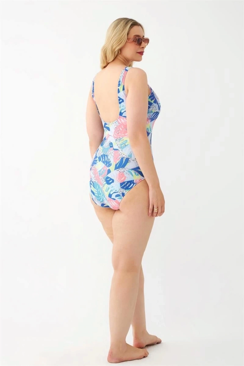 Çamaşır Kenti'nin özel tasarımı Renkli Tropikal Desenli Büyük Beden Tek Parça Mayo, plaj keyfinizi şıklıkla buluşturuyor.