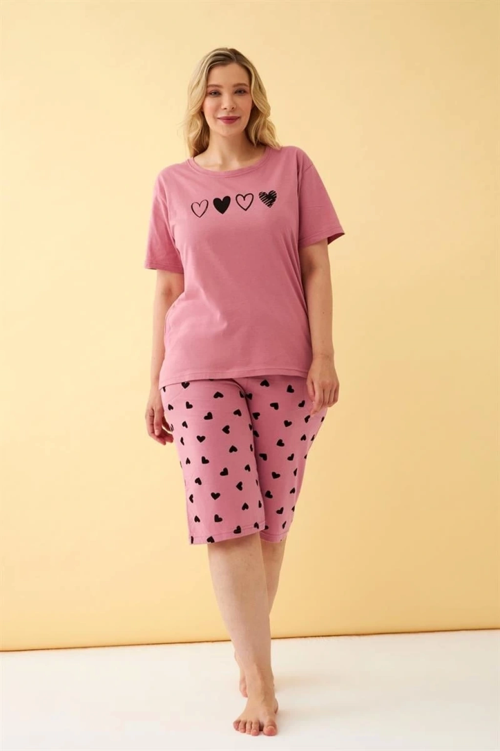 Çamaşır Kenti'nin şık ve rahat tasarımıyla öne çıkan Kadın Somon Kalp Desenli Büyük Beden Kapri Pijama Takımı, gece giyiminde konfor arayan kadınlar için ideal bir seçenektir. -Mankenin üzerinde 3XL vardır
